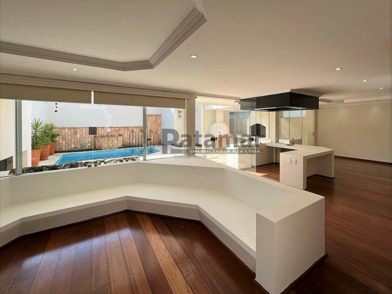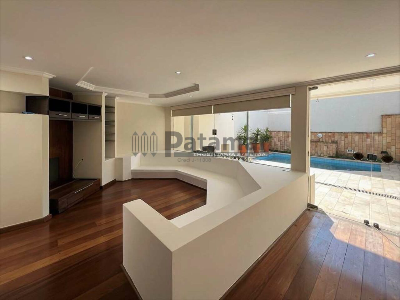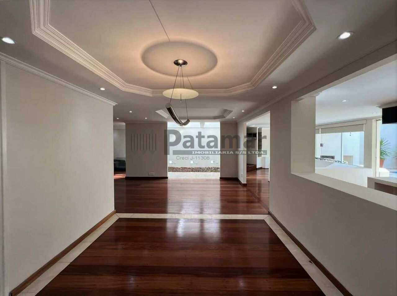 Living para 4 ambientes, com lareira, jardim de inverno e grande claraboia.