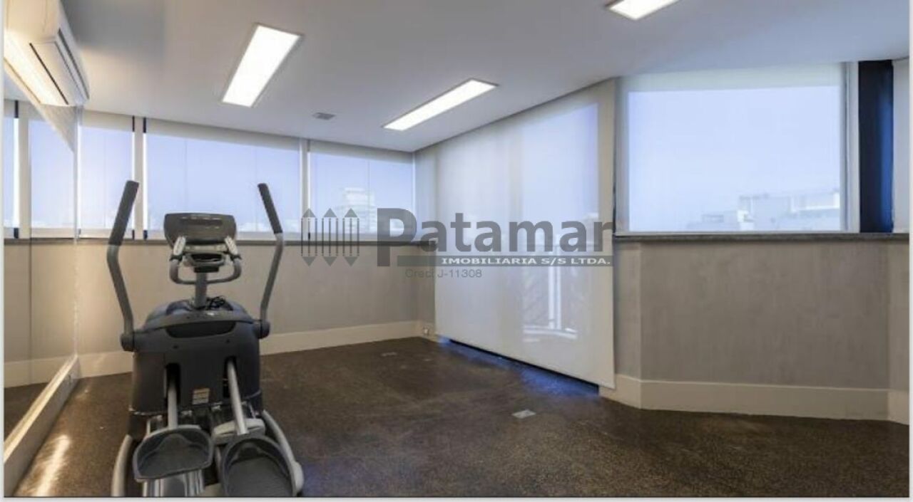 Piso em porcelanato 1,5 x 1,5 m, papel de parede, cortinas rolô, lareira elétrica, painel de madeira da Florense, 2 aparelhos de ar condicionado (1 split LG e 1 cassete Fujitsu); aparador em mármore marrom imperial para bar